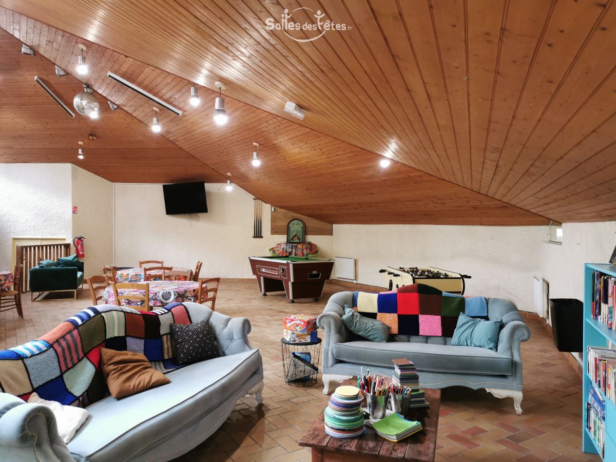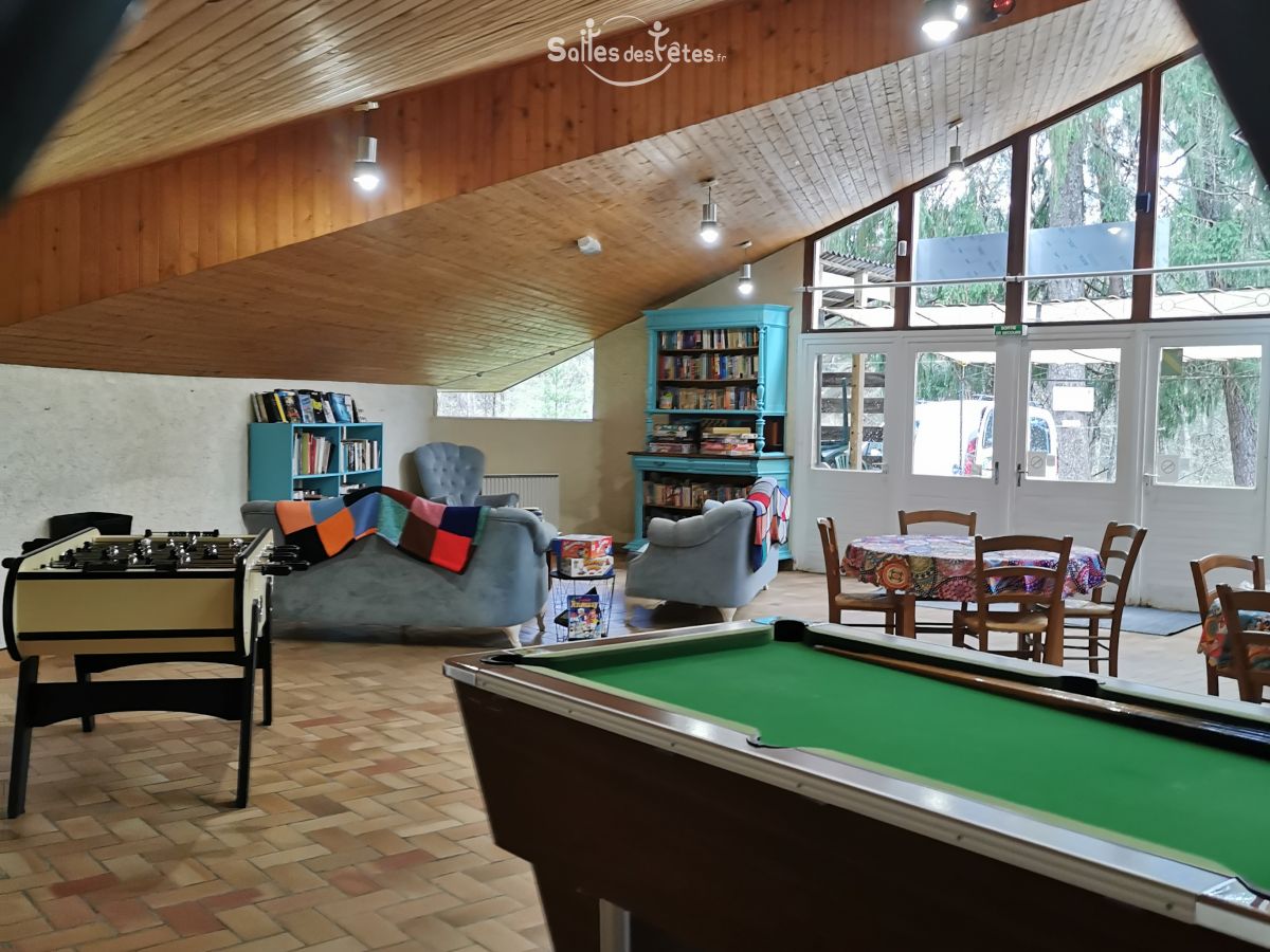 Notre salle commune est disponible en gestion libre, avec accès à une cuisine équipée et un espace plonge, ou en formule avec prestations repas selon vos besoins. Vous trouverez également sur place dans la salle : un billard, baby-foot, salon TV, bibliothèque et jeux de sociétés. Le camping dispose d'une terrasse couverte par une pergola et d'un terrasse ensoleilée avec un barbecue collectif.
