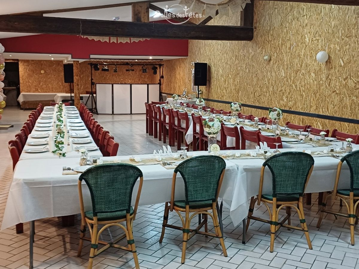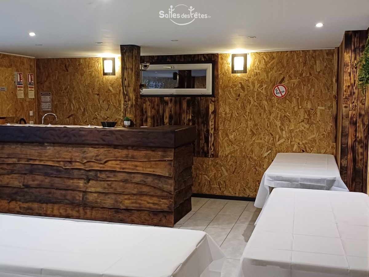 Notre salle est équipée d’une salle de réchauffe avec prise pour étuve traiteur, 2 frigos dont 1 américain, micro-onde, plonge, évier.., d’un bar donnant sur l’accès de la salle avec un évier et un petit frigo, tables rectangulaires et ses chaises.