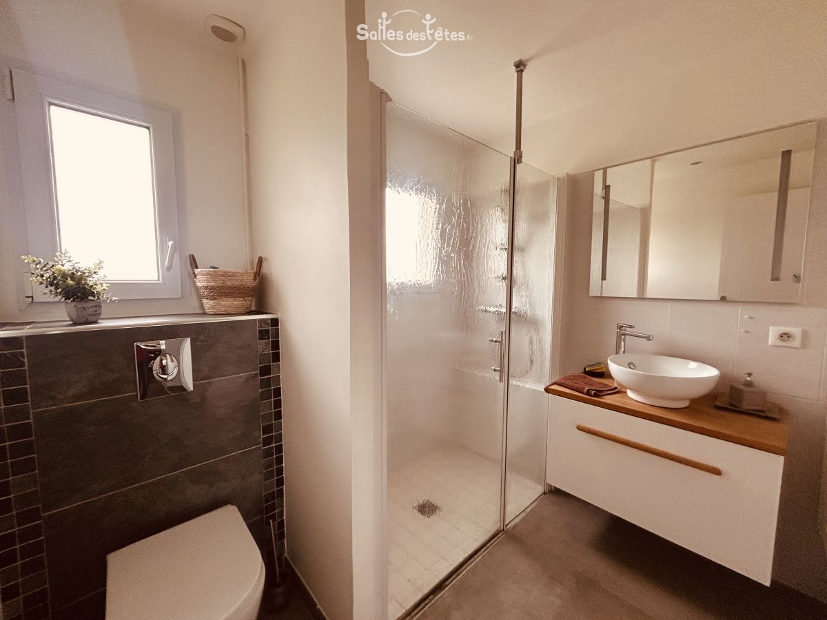 Il s'agit une grande salle de 120 m² unique à l’ambiance champêtre pouvant accueillir environ 70 personnes assises ou plus pour vos réceptions cocktails debout . Vous disposerez d’une spacieuse cuisine toute équipée avec son incroyable îlot central très convivial pour se retrouver avec vos invités, un vestiaire avec coin canapé et des toilettes accès PMR