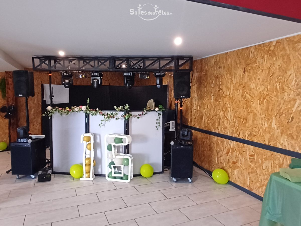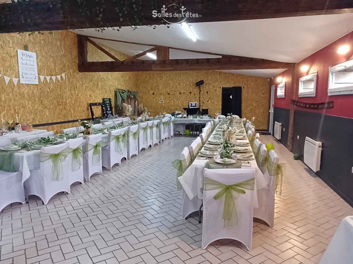 Notre salle est équipée d’une salle de réchauffe avec prise pour étuve traiteur, 2 frigos dont 1 américain, micro-onde, plonge, évier.., d’un bar donnant sur l’accès de la salle avec un évier et un petit frigo, tables rectangulaires et ses chaises.